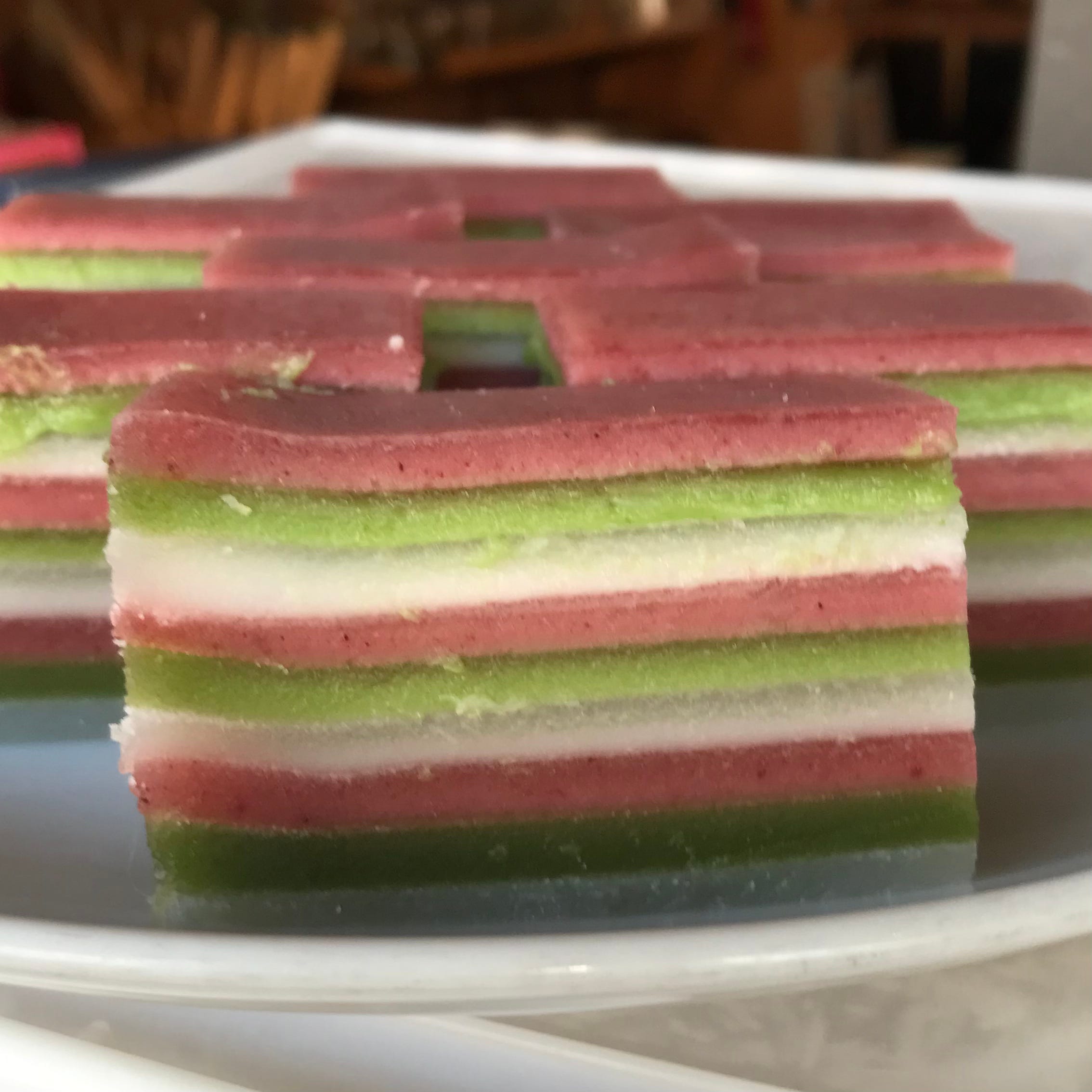 I made this on a winter’s day in Cambridge two years ago. The opacity is a sign that the starch has retrograded, which it does almost instantaneously in the cold. It was perfect for about 15 minutes before the slow firming set in. But the colors in this photo look true to me. Pandan green, a bright, unsaturated red from red yeast rice, alternating layers of red, green, and white. The layers seem cosmetic, but I think the same batter steamed in a single mass would be claggy, one step from solid porridge.